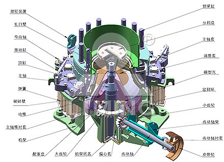 CS圓錐破碎機(jī)主要由機(jī)架、定錐總成、動(dòng)錐總成、彈簧機(jī)構(gòu)、碗型軸架部和傳動(dòng)